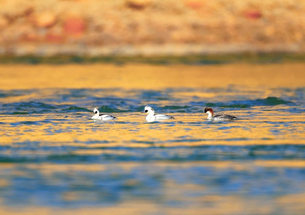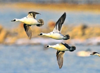 雄鸟繁殖羽头颈白色,眼周和眼先黑色,在眼区形成一黑斑。枕部两侧黑色,中央白色,各羽均延长形成羽冠。背黑色,上背前部白色而具黑色端斑,形成两条半圆形黑色狭带,往下到胸侧。初级飞羽和初级覆羽黑褐色,外侧次级飞羽黑色而具白色端斑,第2~3枚内侧次级飞羽外侧白色或银灰色,其余次级飞羽乌灰色。小覆羽、大覆羽黑色,中覆羽白色,在翼上形成一个大而明显的白色翼斑。肩前部白色,后部暗褐色。腰和尾上覆羽灰褐色,尾羽银灰色。下体白色,两胁具灰褐色波浪状细纹。