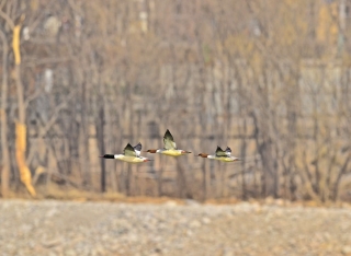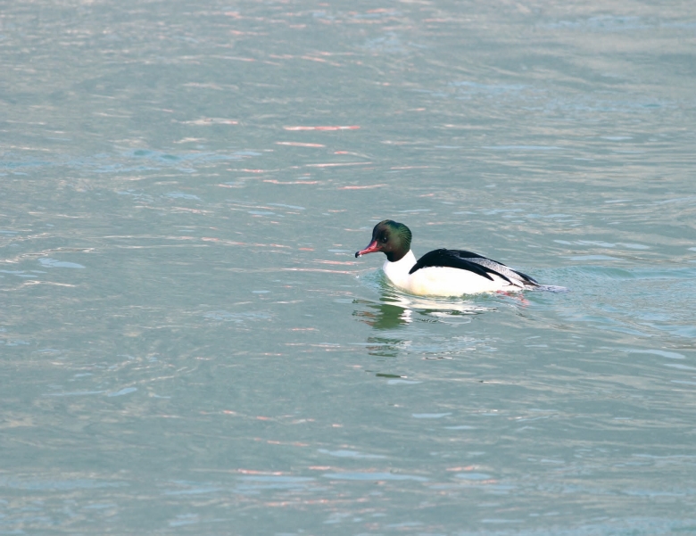 雄鸟头和上颈黑褐色,具绿色金属光泽;枕具短而厚的黑褐色羽冠,下颈白色。上背黑褐色,肩羽外侧白色,内侧黑褐色;下背灰褐色,腰和尾上覆羽灰色,尾羽灰褐色。翼上初级飞羽和覆羽暗褐色;次级飞羽外翈具窄的黑色边缘;大覆羽和中覆羽白色;小覆羽灰色而具白色端斑;翼上各羽之白色形成一个大的白色翼镜。下体从下颈、胸一直到尾下覆羽均为白色。