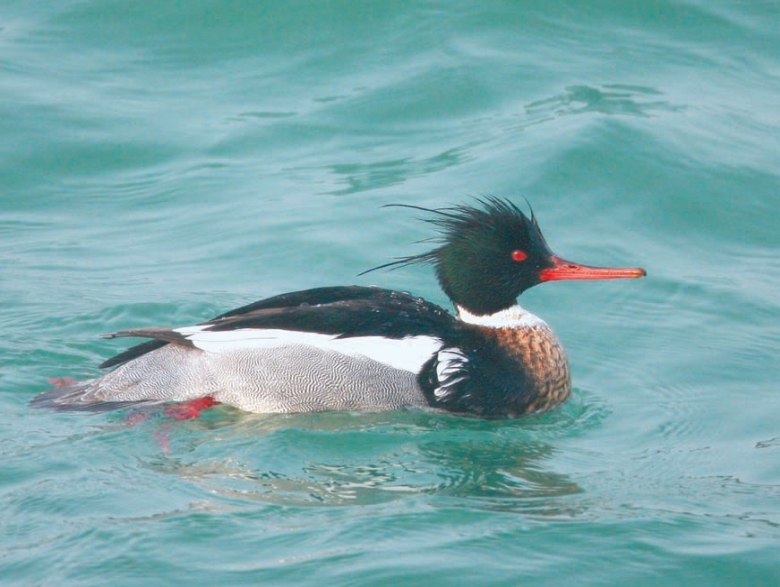 雄鸟头部黑色,具绿色金属光泽,枕部具黑色羽冠。上颈白色,形成一宽的白色颈环;下颈至上胸锈红色,杂以黑褐色斑纹。背黑色,下背暗褐色;腰和尾上覆羽灰褐色,具细密的黑白相间虫蠧状细纹。初级飞羽和覆羽暗褐色,外侧边缘褐色较深;次级飞羽白色,外侧具黑色羽缘;三级飞羽黑褐色;大覆羽、中覆羽白色,小覆羽灰褐色,在翼上形成白色翼镜和大型白色翼斑。外侧肩羽白色,内侧肩羽黑褐色。两胁具黑白相间的波状细纹。下胸至尾下覆羽白色,尾羽灰褐色。