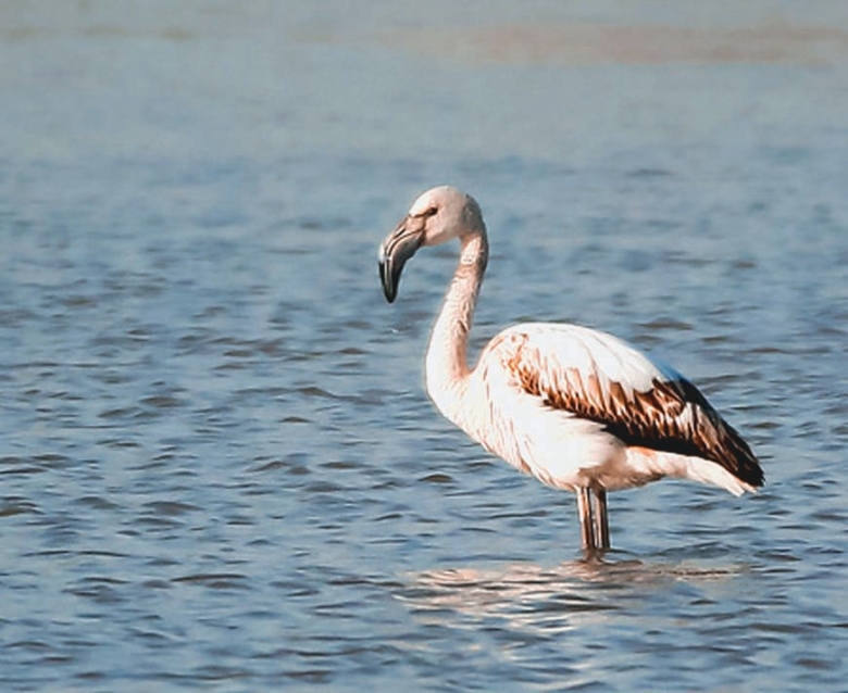 大红鹳又叫大火烈鸟、红鹤、火鹤等,雄雌相似,雄性火烈鸟较雌性稍大。体型大小似鹳;嘴短而厚,上嘴中部突向下曲,下嘴较大成槽状;嘴前端为黑色,中间为淡红色,基部为黄色。颈长而曲;腿极长而裸出,向前的三趾间有蹼,后趾短小不着地;翼大小适中;两翼偏红。尾短,体羽白而带玫瑰色,飞羽黑,覆羽深红;诸色相衬,非常艳丽。亚成鸟体色浅褐,嘴灰色。