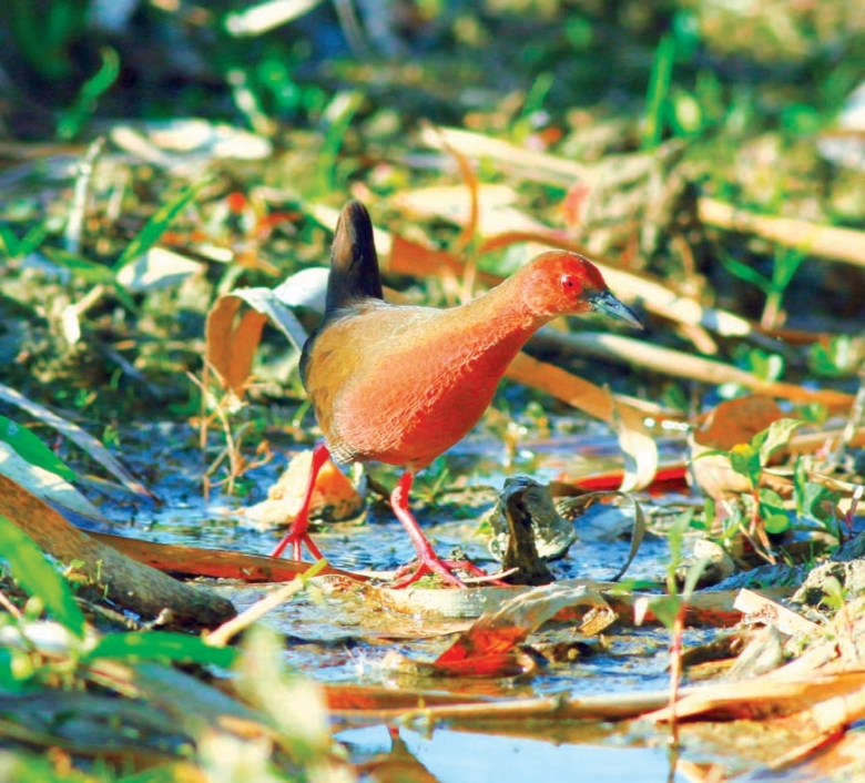 虹膜红色;嘴暗褐色,下嘴基部带有紫色;跗跖和趾橘红色,爪褐色;幼鸟虹膜褐色。