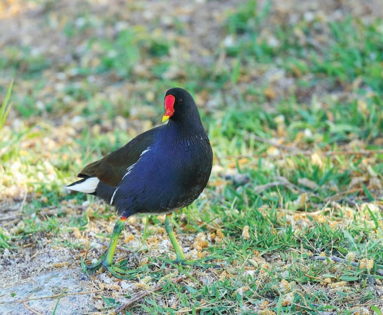 虹膜红色;嘴端淡黄绿色,上嘴基部至额板深血红色,下嘴基部黄色;额板末端呈圆弧状,仅达前额;脚黄绿色,裸露的胫上部具宽阔的红色环带;胫的裸出部前方和两侧橙红色,后面暗红褐色;跗跖前面黄绿色,后面及趾石板绿色;爪黄褐色。