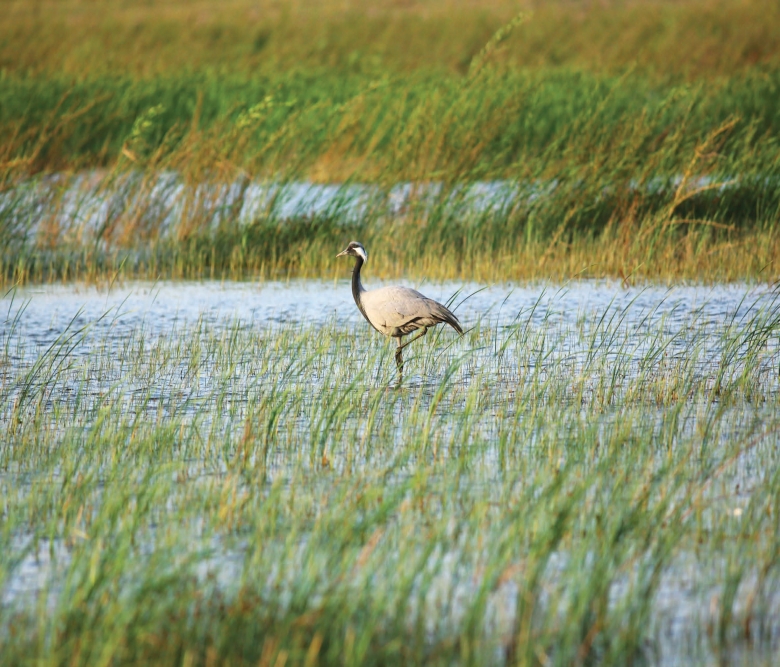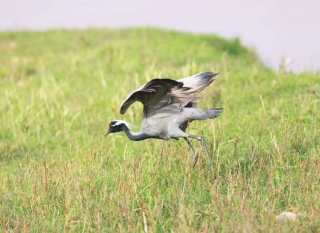 头侧、颏、喉和前颈黑色;眼后和耳羽白色,羽毛延长成束状垂于头侧,头顶珍珠灰色;喉和前颈羽毛也极度延长成蓑状,悬垂于前胸。头、颈和体羽蓝灰色;大覆羽和初级飞羽灰黑色;内侧次级飞羽和三级飞羽延长,覆盖于尾上,为石板灰色,但羽端黑色。