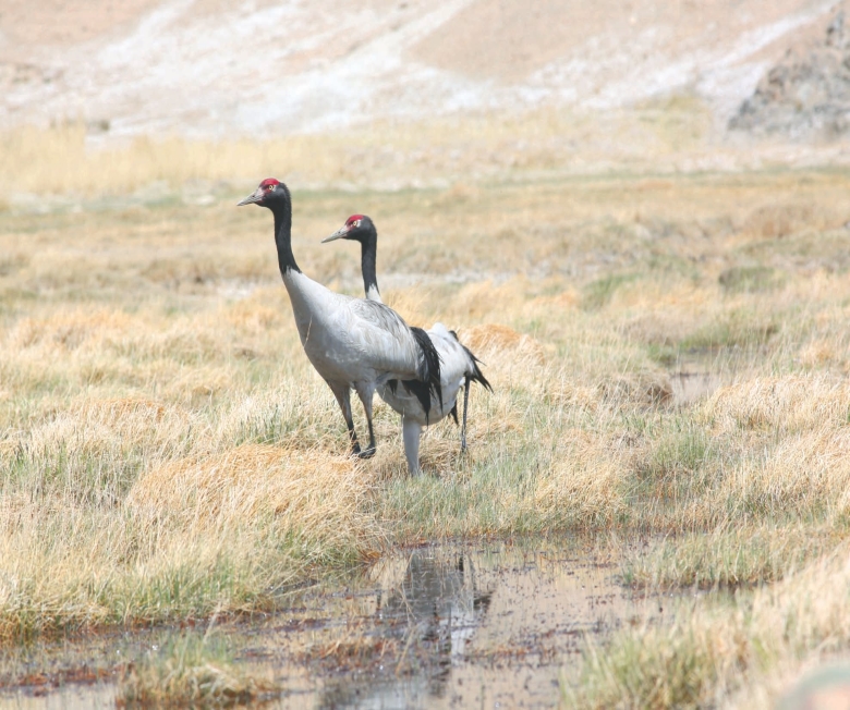 全身灰白色,颈、腿比较长,头顶和眼先裸出部分呈暗红色,头顶布有稀疏发状羽。成鸟两性相似,雌鸟略小。初级飞羽、次级飞羽和三级飞羽黑褐色;三级飞羽延长并弯曲呈弓形,羽端分枝成丝状,覆盖在尾上。尾羽黑色,羽缘沾棕黄色;肩羽浅灰黑色,先端转为灰白色;其余上体及下体全为灰白色,各羽羽缘沾淡棕色。雌鸟上背有棕褐色的蓑羽伸出,雄鹤则不明显。