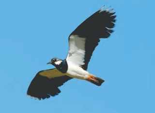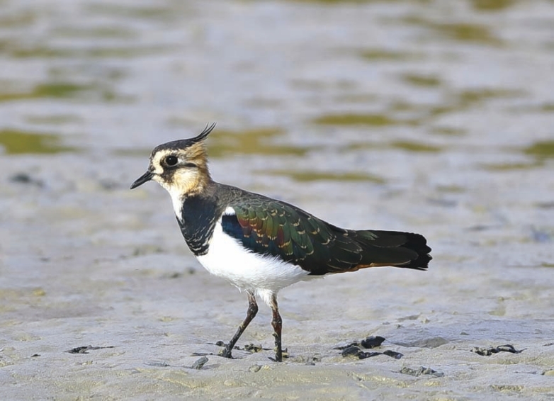 雄鸟夏羽额、头顶和枕黑褐色,头上有黑色反曲的长形羽冠;眼先、眼上和眼后灰白色或白色,并混杂有白色斑纹;眼下黑色,少数个体形成一黑纹;耳羽和颈侧白色,并混杂有黑斑;背、肩和三级飞羽暗绿色或辉绿色,具棕色羽缘和金属光泽;飞羽黑色,最外侧三枚初级飞羽末端有斜行白斑,肩羽末端沾紫色;尾上覆羽棕色,尾羽基部为白色,端部黑色并具棕白色或灰白色羽缘,外侧一对尾羽纯白色;颏、喉黑色,胸部具宽阔的黑色横带,前颈中部有一黑色纵带将黑色的喉和黑色胸带连结起来,下胸和腹白色;尾下覆羽淡棕色,腋羽和翼下覆羽纯白色。