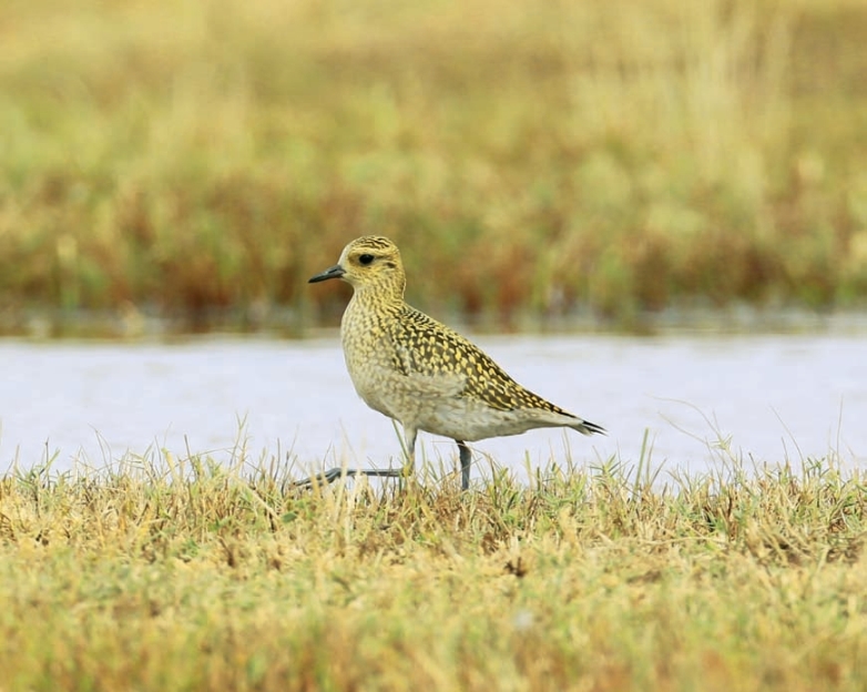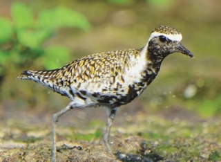 夏羽头顶、后颈及上体余部黑褐色,密布金黄色点斑。脸颊、颏、喉、胸、腹为黑色,自额至眉纹到颈侧、胸有一条“Z”字形白色带,在上下体之间极为醒目。尾羽灰褐,先端内外翈边缘具金色点斑,羽色较淡。