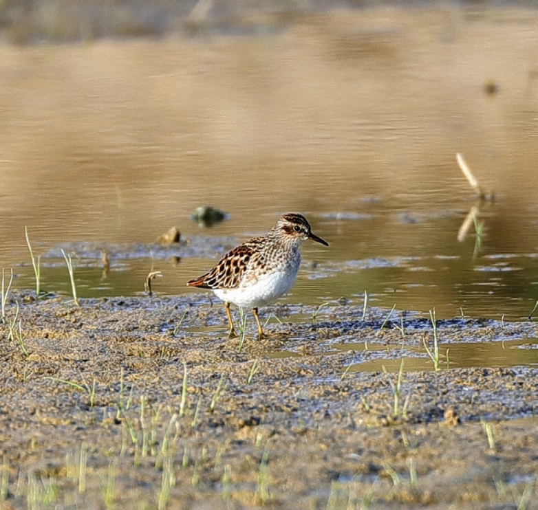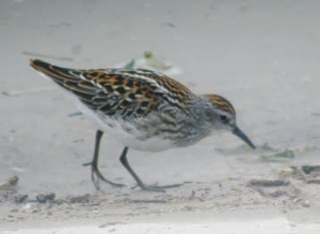 繁殖期上体对比不甚明显,肩部白色的“V”形较窄,头顶线条较模糊。冬羽比青脚滨鹬褐色浓,而较长趾滨鹬上体显色单调,羽中央的暗色较窄。姿势有些下蹲。飞行时腰两侧及尾上白色,白色翼纹比长趾滨鹬长而显著。
