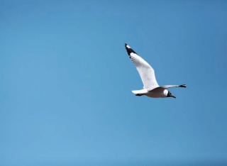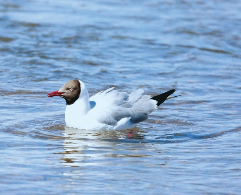 夏羽头淡褐色,在与白色颈的接合处颜色较深,具黑色羽尖,形成一黑色领圈,尤以后颈和喉部明显;眼后缘具窄的白边。背、肩、内侧翼上覆羽和内侧飞羽灰色,外侧翼上覆羽白色;初级飞羽基部白色,末端黑色;外侧两枚初级飞羽黑色,具显著的卵圆形白色亚端斑;内侧飞羽白色,尖端黑色;腰、尾和下体白色。