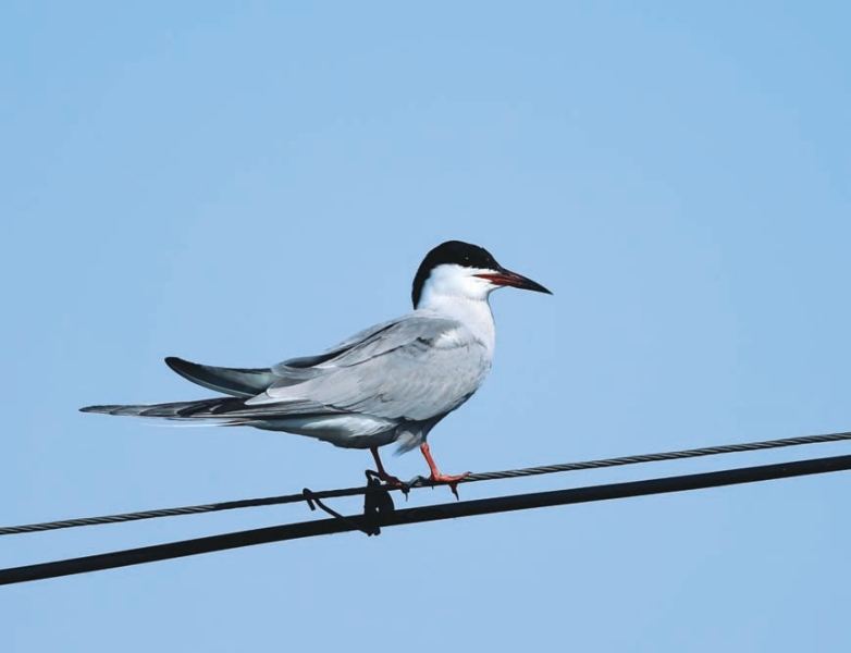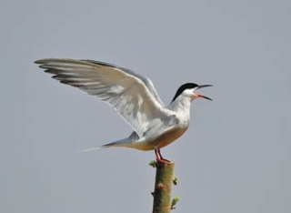 夏羽从前额经眼到后枕的整个头顶部黑色,背、肩和翼上覆羽灰色或蓝灰色,颈、腰、尾上覆羽和尾白色。外侧尾羽延长,外侧黑色;翼折合时长度达到尾尖,尾呈深叉状。眼以下的颊部、嘴基、颈侧、颏、喉和下体白色,胸、腹灰褐色。初级飞羽暗灰色,外侧羽缘银灰褐色,羽轴白色,内侧具宽阔的白缘,由外向内渐次变小;第一枚初级飞羽外侧黑色,次级飞羽灰色,内侧和羽端白色。