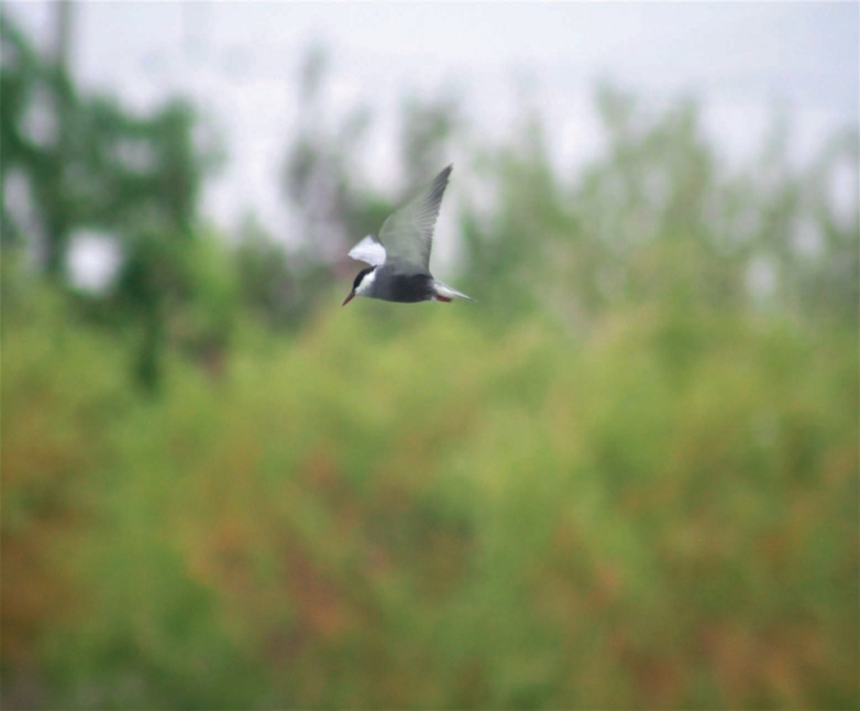 夏羽头顶从前额到枕,包括冠羽黑色,前额基部有时缀有白色。背、肩、翼上覆羽灰色;腰、尾上覆羽和尾羽淡灰色,尾呈深叉状;最长的外侧尾羽外侧几近白色。飞羽较背淡,呈淡灰色;初级飞羽具黑褐色先端。眼先、颊、颏、喉白色,到上胸逐渐变为灰色,下胸、腹和尾下覆羽黑色。翼下覆羽和腋羽白色。