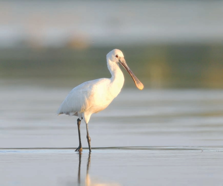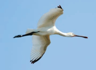 嘴长而直,上下扁平,前端扩大呈匙状,黑色,端部黄色。腿较长,黑色,胫下部裸出。夏羽全身白色,头后枕部具长的发丝状冠羽、橙黄色,前额下部具橙黄色颈环,颏和上喉裸露无羽、橙黄色。