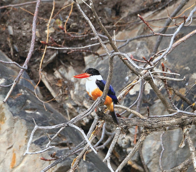 额、头顶、头侧和枕部黑色,后颈白色,向两侧延伸与喉胸部白色相连,形成一宽阔的白色领环;眼下有一白色斑。背、腰和尾上覆羽、尾钴蓝色,羽轴黑色;翼上覆羽黑色,形成一大块黑斑。初级飞羽黑褐色,具蓝色羽缘,外侧基部白色,内侧基部有一大块白斑,其对应处的外侧具一淡紫蓝色斑;次级飞羽内侧黑褐色,外侧钴蓝色。颏、喉、颈侧、颊和上胸白色,胸以下包括腋羽和翼下覆羽橙棕色。
