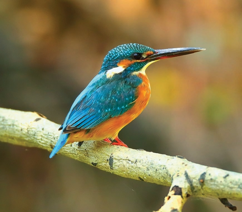 上体金属浅蓝绿色,体羽艳丽而具光辉,头顶布满暗蓝绿色和艳翠蓝色细斑。眼下和耳后颈侧白色,体背灰翠蓝色,肩和翼暗绿蓝色,翼上杂有翠蓝色斑。喉部、颏白色,颈侧具白色点斑;橘黄色条带横贯眼部及耳羽;胸部以下呈鲜明的栗棕色。嘴脊圆形,鼻沟不显著,翼、尾短圆;头大颈短。