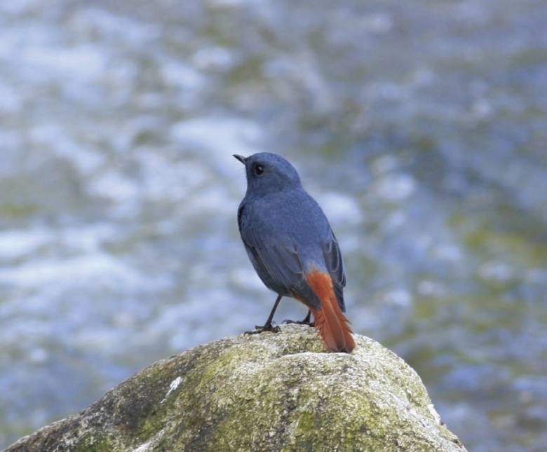 雄鸟通体暗蓝灰色,两翼黑褐色,尾红色。雌鸟上体暗蓝灰褐色,头顶褐色较多,翼上覆羽和飞羽黑褐色或褐色,内侧次级飞羽和覆羽具淡棕色羽缘,尖端具白色或黄白色斑点,在翼上形成两排白色或黄白色斑点。大覆羽、初级飞羽和外侧次级飞羽具褐色或淡色羽缘。尾上覆羽和尾下覆羽白色,尾羽暗褐色,基部白色,并由内向外基部白色范围逐渐扩大,到最外侧一对尾羽几全为白色。下体白色具淡蓝灰色“V”形斑,向后逐渐转为波状横斑。颏沾黄褐色并延伸至颊、眼先和额基等处。
