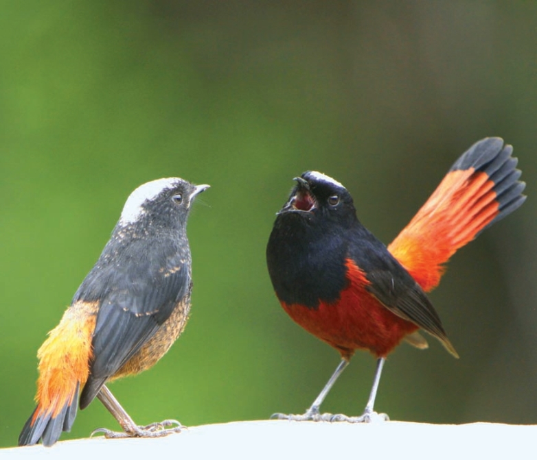 雄性成鸟头顶至枕部白色;前额、眼先、眼上、头侧至背部深黑色而具辉亮。腰、尾上覆羽及尾羽等均深栗红色,尾羽还具宽阔的黑色端斑;飞羽黑色;颏至胸部深黑色并具辉亮;腹至尾下覆羽深栗红色。雌性成鸟与雄鸟同色,但各羽色泽较雄体略稍暗淡且少辉亮。