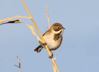 雌性成鸟春羽额、头顶黑褐色,羽缘沙黄;眉纹黄白色;头侧栗褐;背、肩羽暗褐,羽缘栗色;腰和尾上覆羽浅沙黄色;一簇暗褐条纹围绕喉部;胸、胁和尾下覆羽沾沙黄色,两胁并有褐色条纹;腹部中央白色;其他部分和雄羽相似。