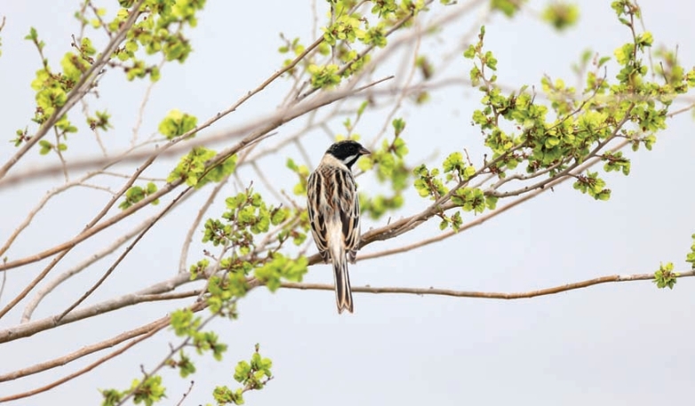 雄性成鸟春羽头顶、颊和耳羽均黑色,头顶的羽缘黄色;后颈具一白色横带,连接颈侧和颊部形成颈圈。背、肩羽黑色,羽缘白色,羽端沾皮黄色;腰和尾上覆羽浅灰色;翼上覆羽一般黑褐色,而小覆羽灰褐色,具淡黄褐色羽缘;中覆羽、大覆羽和内侧次级飞羽的羽缘栗黄,外翈沙黄;小翼羽和初级覆羽暗褐,羽缘灰白;飞羽暗褐,外缘赤褐色。尾羽黑褐,具褐白色羽缘,中央一对尾羽羽缘具黄白色外缘,最外一对尾羽具楔形白斑,从内翈先端斜贯外翈中部,直达近基部。颏、喉和上胸中央黑色;下体余部白色,胸侧沾淡栗灰色,两胁沾赤褐色。