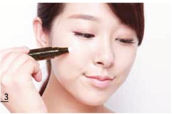 液体遮瑕笔适合保持肌肤亮泽感与水润质地。用遮瑕笔先在眼部下方黯沉处,由下眼睑向脸颊方向呈放射状画几条短线。鼻翼与嘴角处的暗沉也用遮瑕笔薄薄涂抹。