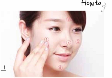 用粉扑蘸取乳化型固体粉底液,注意蘸取粉扑1/3量即可,先从面积大的脸颊开始以按压的手法涂,额头与鼻部轻轻按压,脸部轮廓处滑动粉扑晕开。