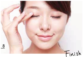 上眼睑可以在后面步骤中使用眼部专用打底产品,不过,这个妆容为了提升水润效果,可以用乳液打底,使脸部每个细节都透出自然光泽感。