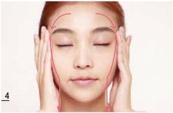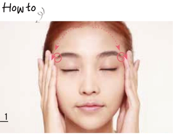 从额头上方,发际线中心处开始向外侧边移动边用手指进行按压,排出脸部的毒素。然后用双手的示指轻轻按压太阳穴3~5秒后,如画圈般地按压。