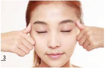 画圈按摩眉部,舒展额头皱纹,恢复肌肤弹性