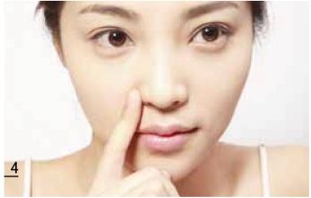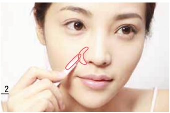 鼻翼作为法令纹的起点,且鼻翼的弧度很容易卡粉,所以要用指腹轻轻地将遮瑕霜按压贴合。