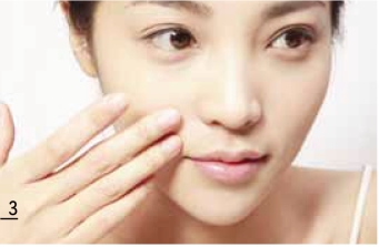 眼部下方的倒三角区多见黑眼圈,凹陷部位易形成阴影,是导致倦容的关键区域。将遮瑕膏沿下眼睑的黯沉部位画几条弧线,然后轻轻拍按,借助遮瑕使肌肤呈现透明光泽感,消除黯沉印象。