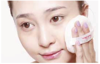 在全脸扑蜜粉,大面积按压全脸后,将粉扑对折后用粉扑角按压眼睛周围促进贴合,注意不要擦拭。