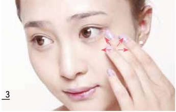 涂粉底液后,在上下眼睑涂上眼部专用的保湿妆前乳,单侧用量约一个米粒大小。在细纹较明显的眼角、眼尾、下眼睑处薄薄地抚匀,要避免卡粉。