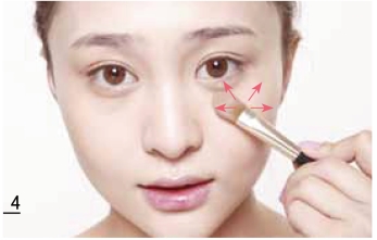 在涂抹妆前乳的眼周轻刷上一层高光粉,用刷头从眼角向眼尾轻刷、选择色泽较自然的米色高光粉。