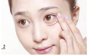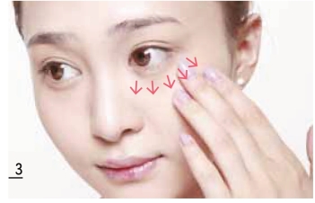 接着用指腹向脸颊方向,小幅度地轻轻向下拍按,注意不要蹭到黑眼圈中部,只将遮瑕液下缘与周围皮肤衔接处拍匀即可。