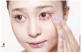 最后向下睫毛方向,小幅度地轻轻向上拍按,将遮瑕液上缘向睫毛根部过渡开,涂抹均匀。