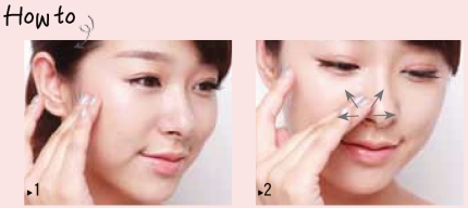 2 毛孔明显的地方,用指腹上下左右向周围轻轻晕开,消除多余的油脂,借助粉底的光反射作用,使毛孔变得不明显。