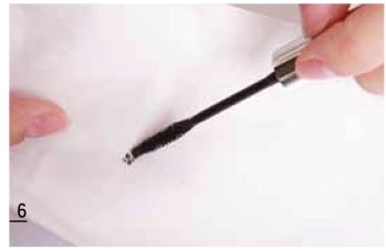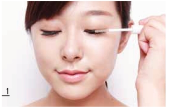 睫毛根部至少涂刷3秒后,向睫毛梢的方向,向上提拉刷头。需要重复涂刷时,蘸睫毛液后先调整刷头上的用量,然后重复步骤1、2。