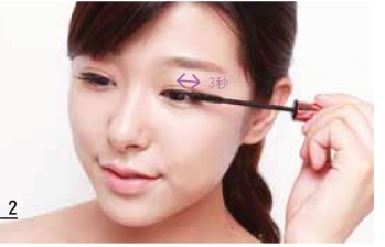 先涂刷中央部分的睫毛,将睫毛膏置于睫毛根部,小幅度的左右移动刷头,保持3秒,使睫毛膏充分附着在睫毛根部。