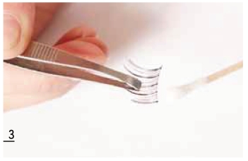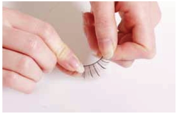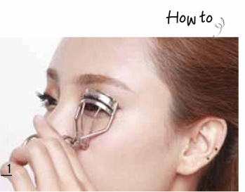 粘贴假睫毛前先夹好睫毛。用睫毛夹从睫毛根部开始,按72页的方法将睫毛夹出弧度。