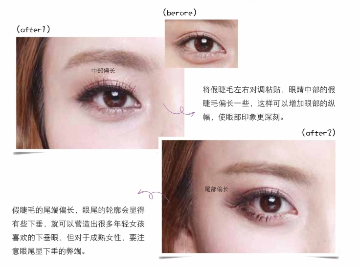一般的假睫毛越靠近眼尾越长,会呈现下垂眼尾,如果左右对调假睫毛,就可以增加眼部中央睫毛的长度。