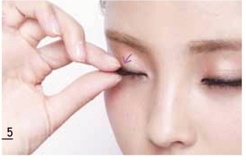 趁胶水未干之前,用指腹轻轻地捏住真假睫毛,利用手指增加睫毛的贴合度,消除根部的分层空隙,使真、假睫毛更好地结合为一体。