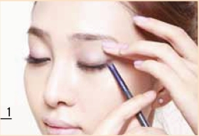 重叠涂黑眼球上方,中间最高,略成拱形。眼尾上扬的高度不要过大,顺着眼尾的弧度微微上扬才会显得自然。