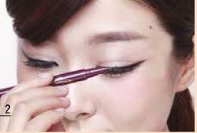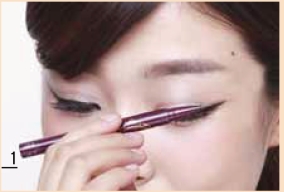 用眼线液前,可以先用眼线笔沿睫毛根部粘膜描画内眼线,填补睫毛间隙。将眼线液的笔尖放在眼尾处,沿着眼线笔描画的线条一口气画到眼角。