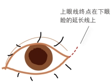 眼线终点位于下眼尾的延长线上。画自然眼妆只画上眼线时,上眼线在眼尾处一般不要拉长;如果下眼睑上妆的话,上眼线就可以延长出眼尾,需要注意的是,吻合眼形的眼线长度,应在下眼睑的延长线上。