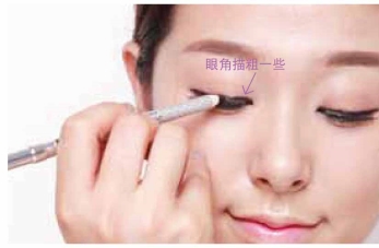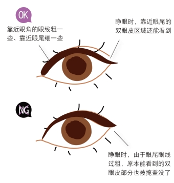 内双眼皮靠近眼角一侧的眼皮重合,眼尾一侧能看到双眼皮。画眼线时,靠近眼角一侧的眼线和描画单眼皮眼线一样,描得稍微粗一些,靠近眼尾逐渐收细,以睁开眼时,眼尾的眼线不会完全遮盖住双眼皮区域为准。