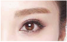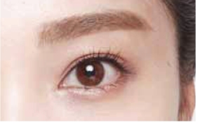 ▲只描画上眼线时,眼线终点落在眼尾处,不拉伸,呈现自然柔和的眼部印象。对于初学者,描画黑色眼线容易显得线条生硬,脱妆也很明显,选择颜色自然的茶色或棕色眼线笔,描画后会显得更柔和一些。
