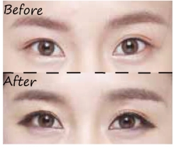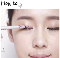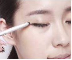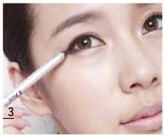用手指轻拉鼻侧皮肤,使眼角处的粘膜露出,用黑色眼线笔仔细沿粘膜将眼角泛白处填满。从眼部中央开始加粗上眼线,眼尾部分水平拉长,有如上睫毛被延长的感觉。