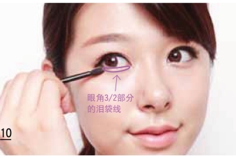 用海绵棒蘸取“影色”眼影,在下眼睑靠近眼尾1/3部分涂具有收敛作用的“影色”眼影,从眼尾向眼角方向移动刷头,细细地像画线般涂抹。这样可以使眼尾的颜色较深,强调出目光的深邃感。