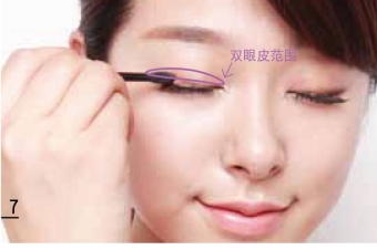 用海绵刷蘸取“中间色”眼影,涂抹在“亮色”与“影色”之间,完成眼睑从上向下的淡到重的渐变效果。沿步骤6涂抹的影色上方,重叠涂抹“中间色”眼影。涂抹范围为双眼皮的宽度。之后用眼影刷轻轻将“影色”边线晕染开,使颜色过渡自然。
