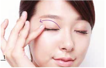 眉头正下方至眼角,用“亮色”眼影描画“<”形集中提亮,提升眼部透明度,以包围住眼角的方式涂抹。如果感觉涂后颜色过亮显得不自然,可以用指腹将眼影轻抹晕开即可。