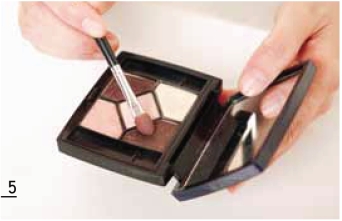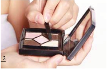 用海绵棒蘸取具有收敛效果的“影色”。用海绵棒大面积涂抹眼影时用刷头的宽面蘸取,窄幅涂抹时用刷头的尖部,变换眼影刷的角度更顺手。