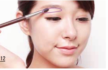 用眼影刷蘸取“亮色”眼影,与步骤6涂抹的“中间色”眼影略重合,在眉毛下方与眼窝之间大面积涂抹。从眉头向眉尾一气呵成,不要来回涂抹导致着色过厚显得亮色过于突兀。